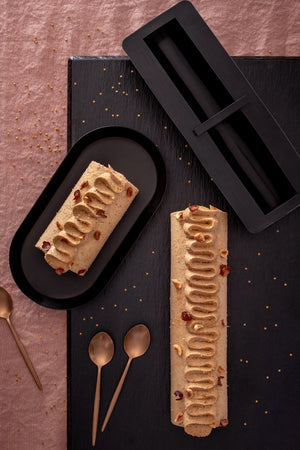 The smart Flexipan® Log Mold is the perfect for making two different dishes in the same mold, for example, a vanilla hazelnut Yule log on one side and a raspberry mascarpone log on the other.