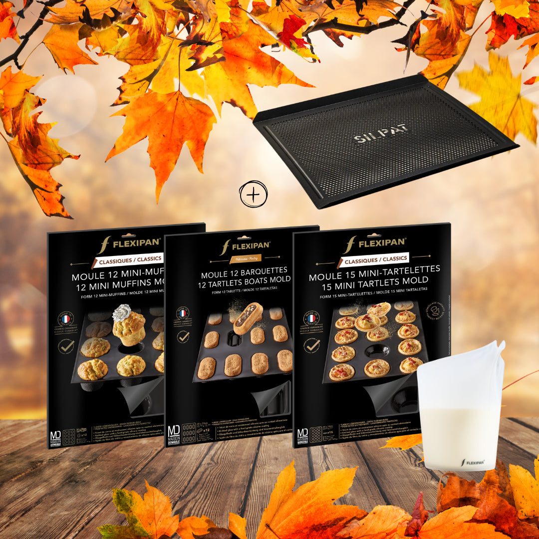 Savourez la chaleur et la gourmandise de la saison avec notre Kit Spécial Automne signé Flexipan® ! Idéal pour des recettes sucrées ou salées à partager en famille ou entre amis, ce kit vous accompagne dans toutes vos envies réconfortantes, du brunch au goûter en passant par l’apéritif dînatoire.