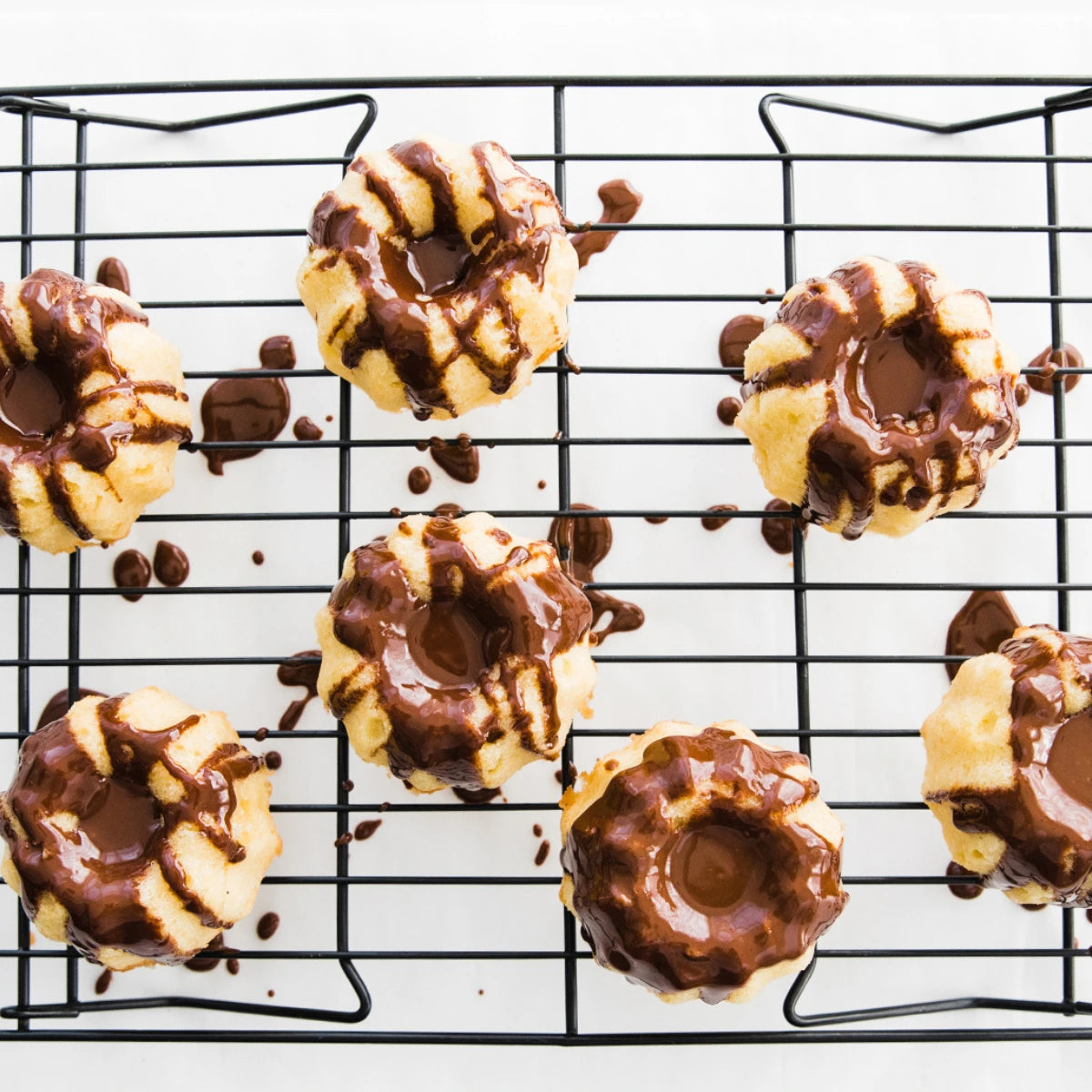 Laissez libre cours à votre imagination et créativité en préparant de délicieuses créations culinaires sucrées ou salées avec le moule Silpat® 8 mini-cakes striés. On vous délivre l'une des recettes phares de notre moule : Un petit gâteau aussi bon que beau : Le gâteau vanille avec glaçage au chocolat !